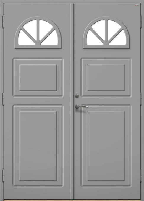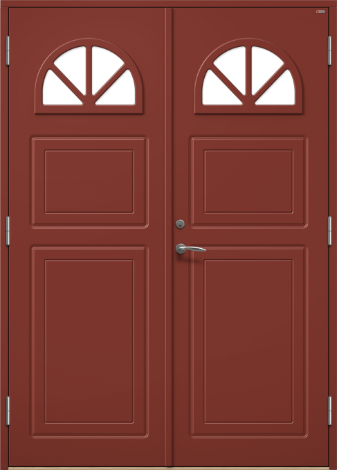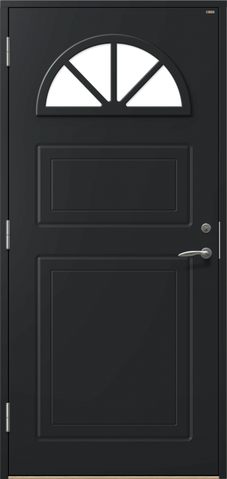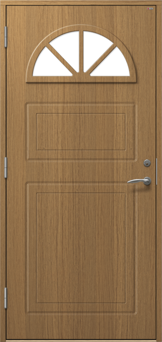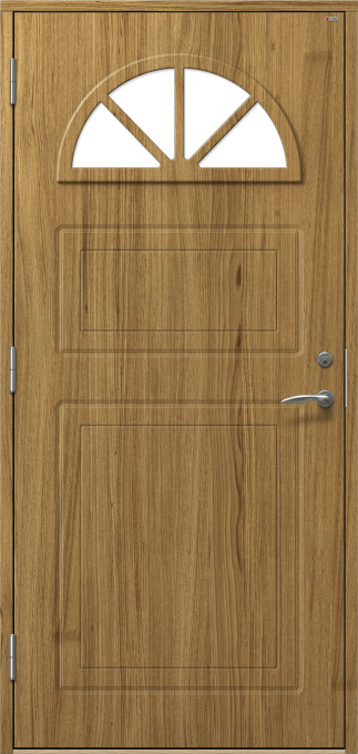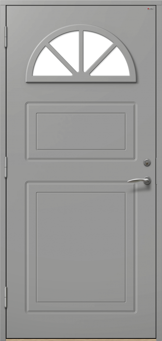 Dörr med frästa detaljer och halvmåneformat fönster med spröjs.