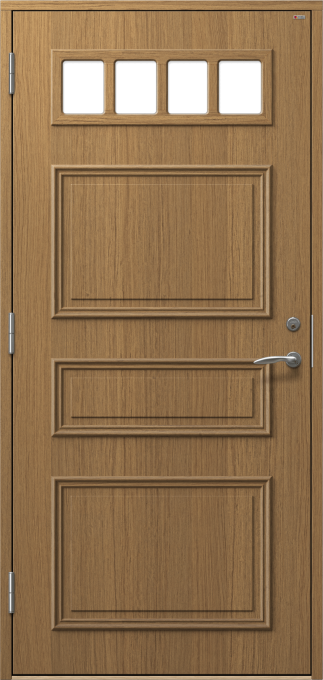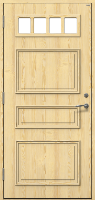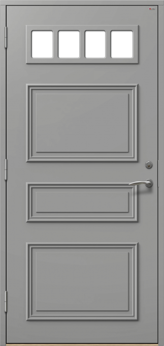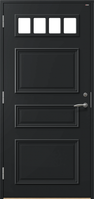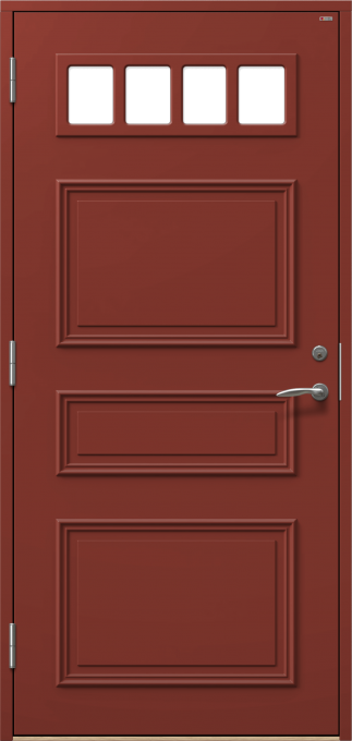 Ytterdörr med dekorramar och dekorplattor på utsidan.